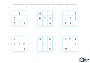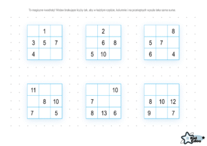 Zapraszam do zabawy z magicznymi kwadratami – wyjątkowymi łamigłówkami, które rozwijają logiczne myślenie, spostrzegawczość i umiejętność dodawania. Zadaniem dziecka jest tak uzupełnić liczby w kwadracie, aby suma w każdym rzędzie, kolumnie i na obu przekątnych była taka sama.